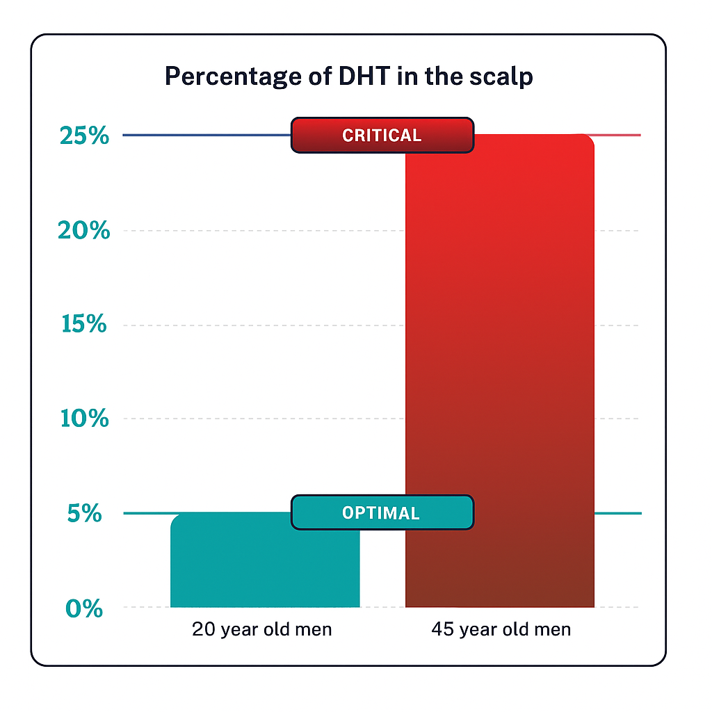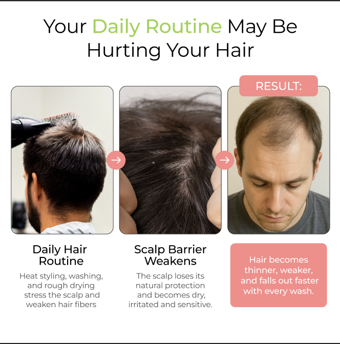 But over time, stress, rising DHT levels, harsh shampoos, and scalp imbalance break down that protective system.