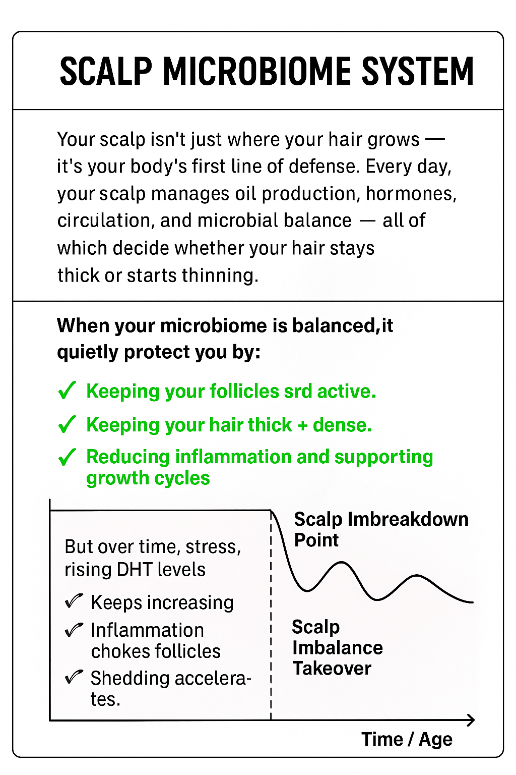 Your scalp isn’t just where your hair grows — it’s your body’s first line of defense. Every day, your scalp manages oil production, hormones, circulation, and microbial balance — all of which decide whether your hair stays thick or starts thinning.