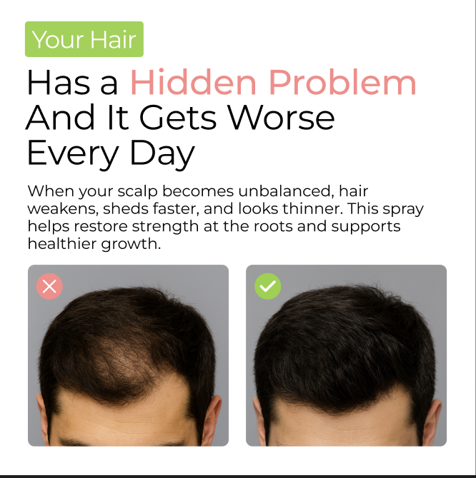 When your scalp becomes unbalanced, hair weakens, sheds faster, and looks thinner. This spray helps restore strength at the roots and supports healthier growth.